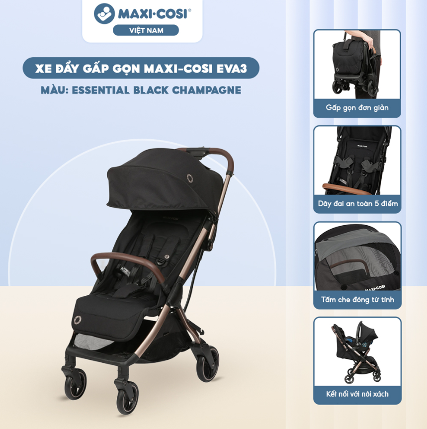Maxi-Cosi Eva3 có thể tự động gấp gọn chỉ bằng 1 nút bấm.